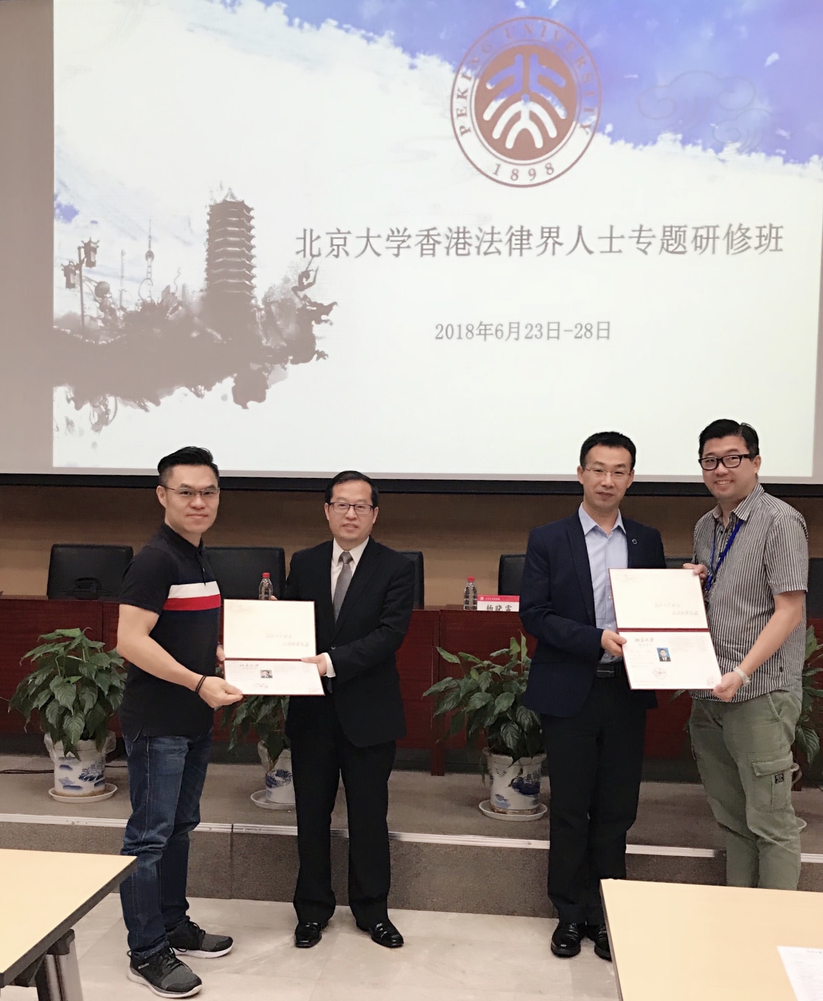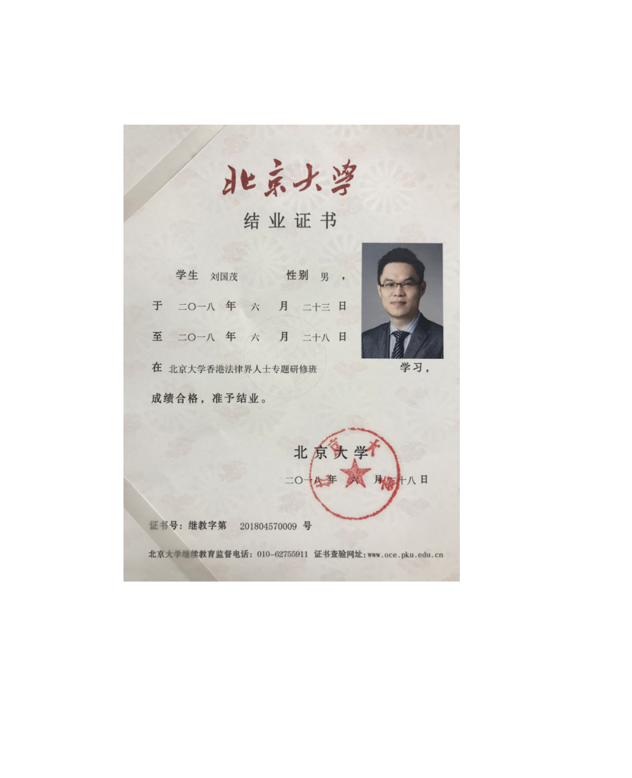 新知 | 承蒙中聯辦法律部邀請,本所劉國茂律師以班長身份參加並完成“北京大學香港法律界人士專題研修班” By LTLawyers Posted June 28, 2018 In News 1 承蒙中聯辦法律部的邀請,本所劉國茂律師以班長身份參加 “北京大學香港法律界人士專題研修班”,向中國最高人民法院法官、港澳司法辦主任、司法部處長、國務院港澳辦司長、北京大學法學院、經濟學系泰斗學習,就包括“內地與香港司法互助安排相關法律實務”, “中國司法制度與司法改革”等議題進行了深入探討,成績合格,獲頒發結業證書,且在過程中有幸參訪百度公司,與專利事務部團隊交流。 6月22日至6月28日